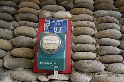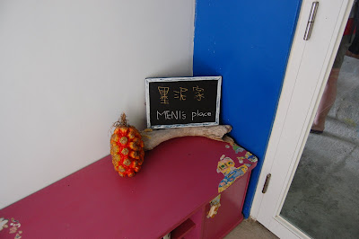 墨泥早就在迎客走道迎接我們。雖然從電話聲音中就猜想墨泥應該是在都市中長大的孩子,但見到面後,還是十分驚訝墨泥身上散發出的道地都市人味道。一個都市成長的女孩,會選擇蘭嶼做為她人生中一個停靠站,背後想必有一段動人的故事。墨泥的家在紅頭村,離機場僅約5分鐘,沿途墨泥就迫不及待介紹起沿路上經過的「無餓不坐」餐廳、有名的「女人魚」民宿、可愛的「荳芽菜」(現己改名為"2/6"),路上還巧遇Vivi的朋友March,一行人己經準備搭船離開,算一算等會還有時間去開元港送個行哩。從八代灣的荳芽菜往左前方看有一棟藍紅色外觀的建築,那就是墨泥的家啦,交通非常方便,離陳建年駐守的派出所也不過10來步的距離而己。先來一張派出所的跳跳照 :P。