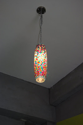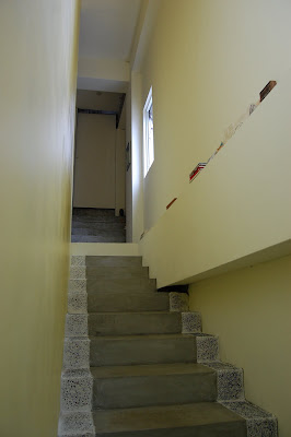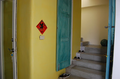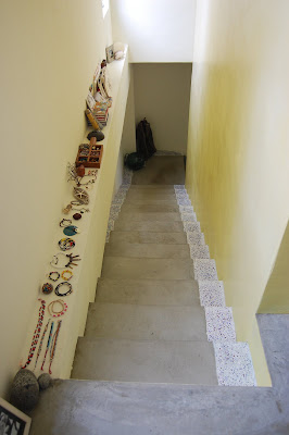 墨泥說單人房客人尚未退房,退房時間是10點,她整理過後,11點才能Check in。墨泥先請我們再客廳休息一下隨意參觀,墨泥家房子外觀及二樓房間完成度較高,門口左邊小台上一塊小黑板,上面寫著「墨泥的家 MENI’s Place」,鵝黃色的牆壁上掛了一幅畫,右側有二片墨綠刷白的門虛掩著往二樓房間的樓梯,進去一瞧,陽光大片灑落在階梯上,而且深具巧思的利用階梯右側一列空白擺滿精巧的手工藝品,順著階梯拾級而上彷彿走在一條穿越時空的光廊,讓人滿心期待階梯盡頭的另一端會呈現什麼樣的光景,由於樓上尚有客人,我們沒敢打擾,靜靜退出。進到一樓屋內客廳,還看得出來鑿刻的痕跡,四周牆壁維持著最原始的水泥,雖然粗樸卻不突兀,反而散發出一股堅實平穩安心的力量。一面牆壁上放上幾封前房客寄來的信或明信片,述說著對蘭嶼念念不忘的情緒及對墨泥小施熱情款待的感謝,不難相信墨泥家以後一定也是像女人魚一樣成為蘭嶼高人氣民宿。