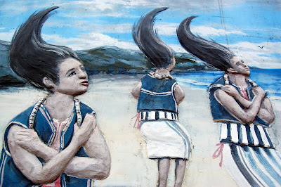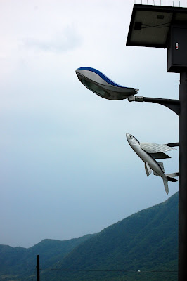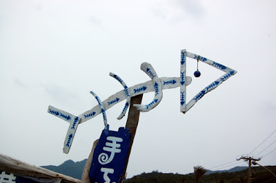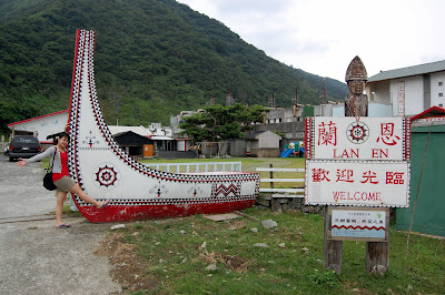 繞過山頭,東清村果然馬上浮現在眼前,東清村素以東清灣日出聞名,此時天空雲層漸厚,太陽隱身在雲層之後,若隱若現,從雲層縫隙中透出幾縷陽光,方才炙熱難以直視的陽光,這時變得柔和,好似黎明旭日初升時。我們肚子也有點餓了,我也尿急,想起墨泥有推薦東清村的人魚與貓,於是我們決定前去人魚與貓找點吃的、上個廁所,沒想到從村頭騎到村尾,竟然都沒看到人魚與貓,我只好下車走進村落巷內,詢問一下在地村民,我胡走亂走,正巧撞見一組三人正作製作拼板舟,看著他們認真莊嚴的神情,我也不敢冒昧打擾,在回到停車的路上,終於碰到一位小男孩,一問才知我們騎過頭了,人魚與貓就在村頭環島公路旁。折返回去,果然看到一塊寫著「人魚與貓」的小小招牌,原以為是像無餓不坐或是道香星村般的簡餐店,沒想到是稍為簡陋破舊的鐵皮屋,剩餘的殘肴撒滿桌子,原本滿溢的飢餓感一下子消失的無影無蹤,我們借完廁所後就匆忙離開。在東清村信步閒晃,村尾那間警察局似曾相識,經Vivi提醒才回想起這間警察局曾出現在「等待飛魚」這部電影裡,男主角爸媽的老家好像就住在警察局的後面,在意外連結起「等待飛魚」電影場景後,之後開始注意其他電影場景,沒想到這個意外的連結讓我們發現一個大秘密,先暫時賣個關子,往下看就知道啦。